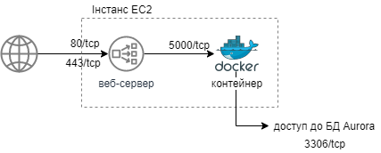 Налаштувати реверсивний HTTP-проксі на вашому EC2-інстансі, який проксіюватиме веб-трафік із портів 80/tcp (HTTP) та 443/tcp (HTTPS) на розгорнутий у попередньому завданні додаток у контейнері Docker. Додаток має бути доступним на хості за-вмовчанням (без прив'язки до домену).